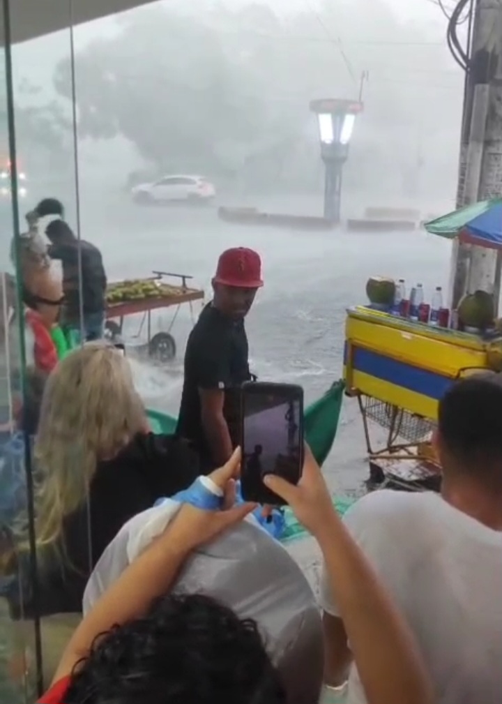 O temporal trouxe transtornos no trânsito e danos estruturais. Rajadas de vento arrancaram telhas de residências e destruíram parte de uma instalação recém-montada na Feira do São Jorge. Moradores registraram cenas de risco em diversos pontos da capital. No Centro, a entrada de uma galeria ficou totalmente coberta pela água, impedindo a saída de quem estava dentro. Na zona Sul, famílias foram obrigadas a buscar abrigo em áreas mais seguras após os ventos destelharem casas.